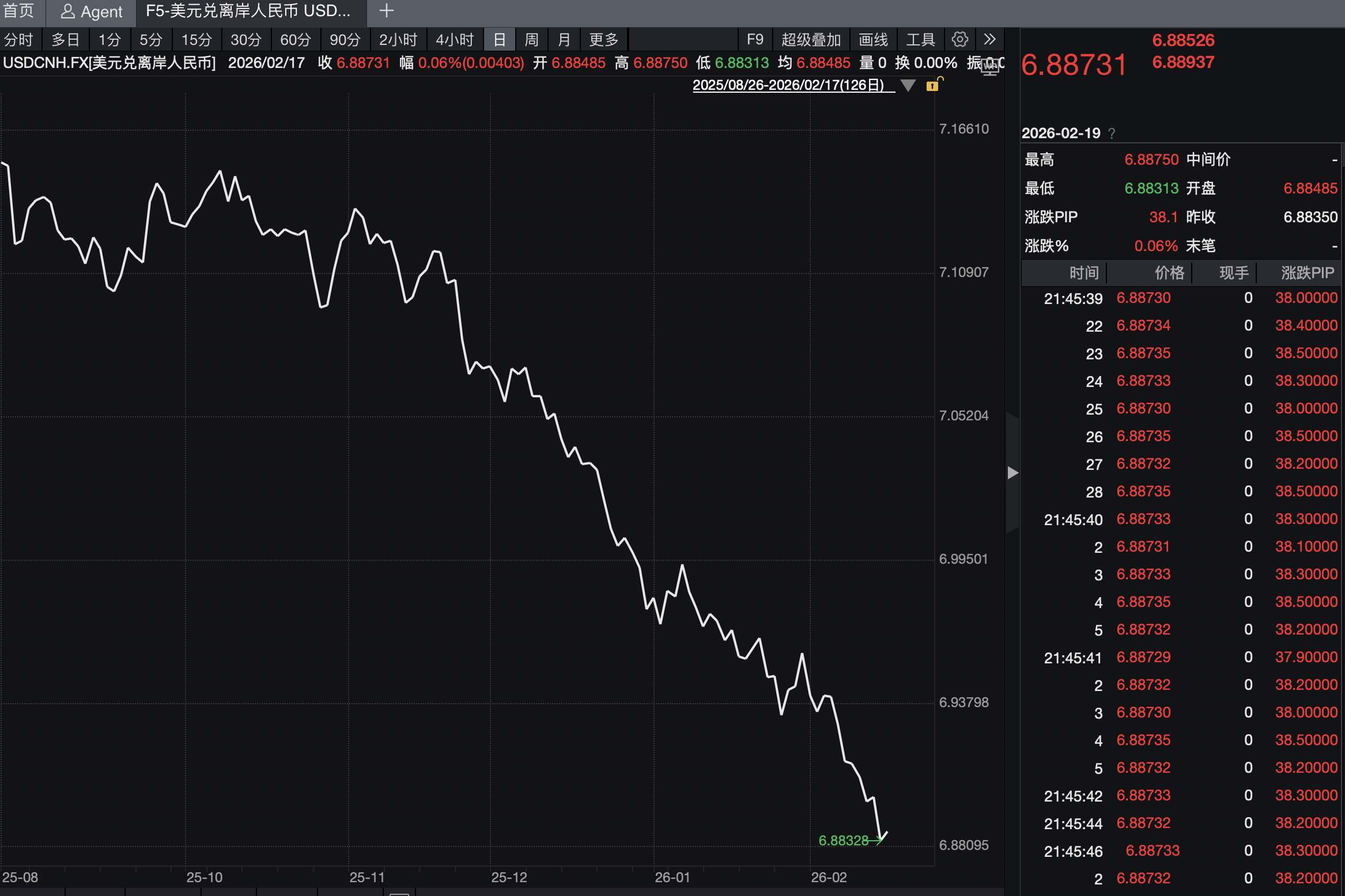 2月16日晚间,离岸人民币汇率盘中升破6.89。