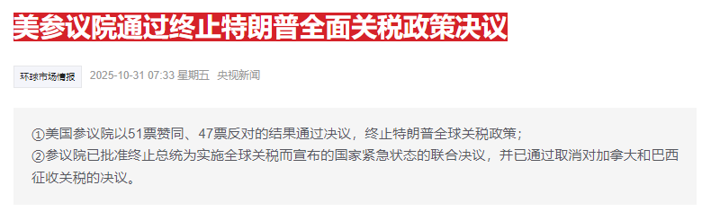 据报道,美国参议院以51票赞同、47票反对的结果通过决议,终止美国总统特朗普在全球范围内实施的全面关税政策。
